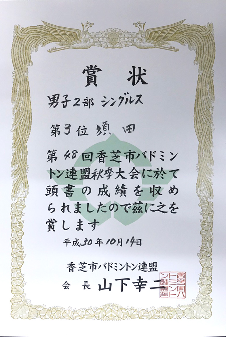 2018年10月14日 第48回香芝市バドミントン連盟秋季大会 男子シングルス 第三位